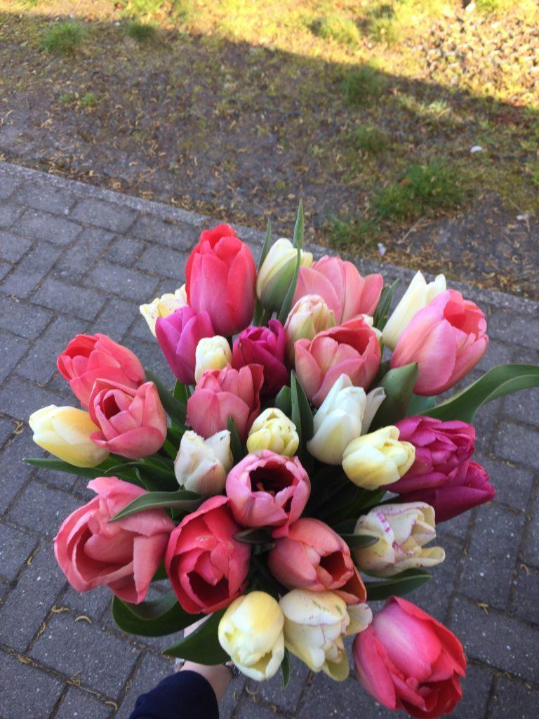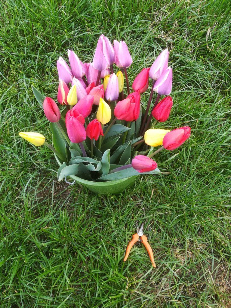 L’eau sera de préférence tiède dans un premier temps. Ensuite la changer tous les 2 jours avec de l’eau froide, y ajouter un peu de sucre et couper les tiges en biseau de quelques centimètres, surtout que les tulipes continuent à s’allonger en vase.